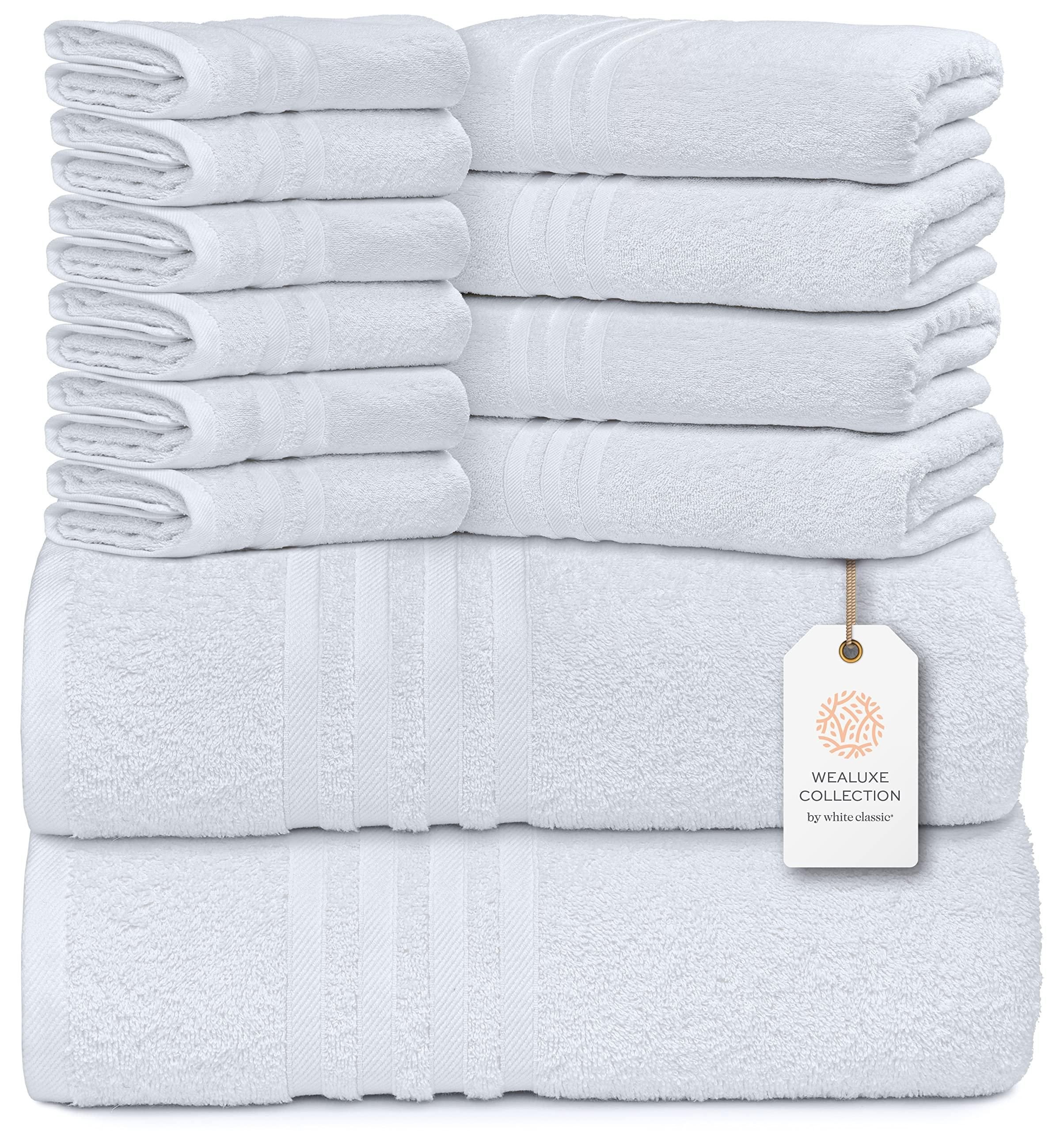 1.superior softness and comfort: indulge in the luxurious softness and unparalleled comfort of the wealuxe 12 pc bathroom set in white. each towel is meticulously crafted using premium materials, providing a plush and velvety touch against your skin. experience a moment of pure indulgence as you wrap yourself in the sumptuous softness of these white towels, making your daily bathing routine a truly pampering experience. exceptional absorbency and quick drying: experience quick and efficient