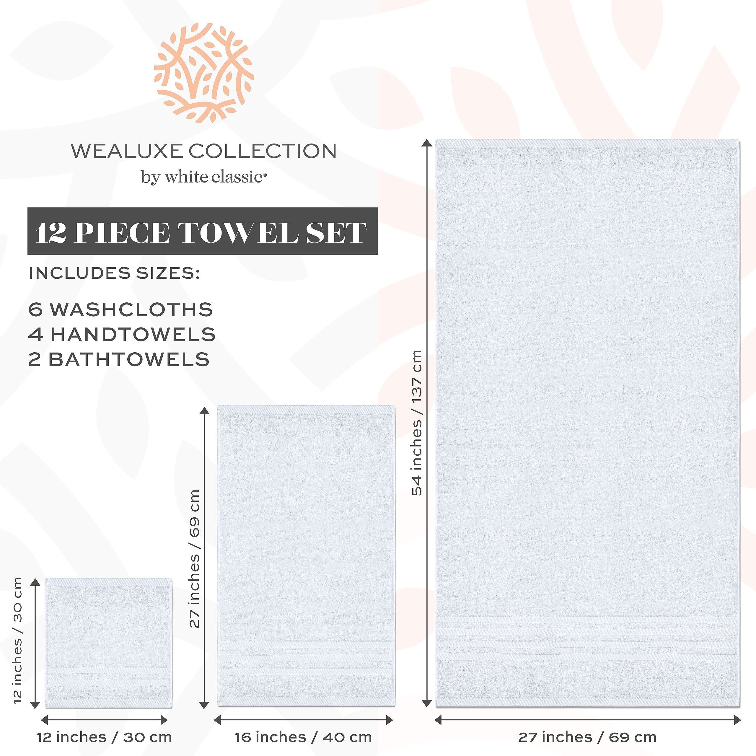 3.generous coverage, four hand towels for drying hands or face, and six washcloths for versatile tasks. with this range of sizes, these white towels ensure you have the perfect towel for every occasion, personal use, or guest accommodation. experience convenience and versatility with our white bathroom set. long-lasting durability: experience long-lasting quality with the wealuxe 12 pc bathroom set in white. crafted with high-quality materials and expert craftsmanship, these towels are