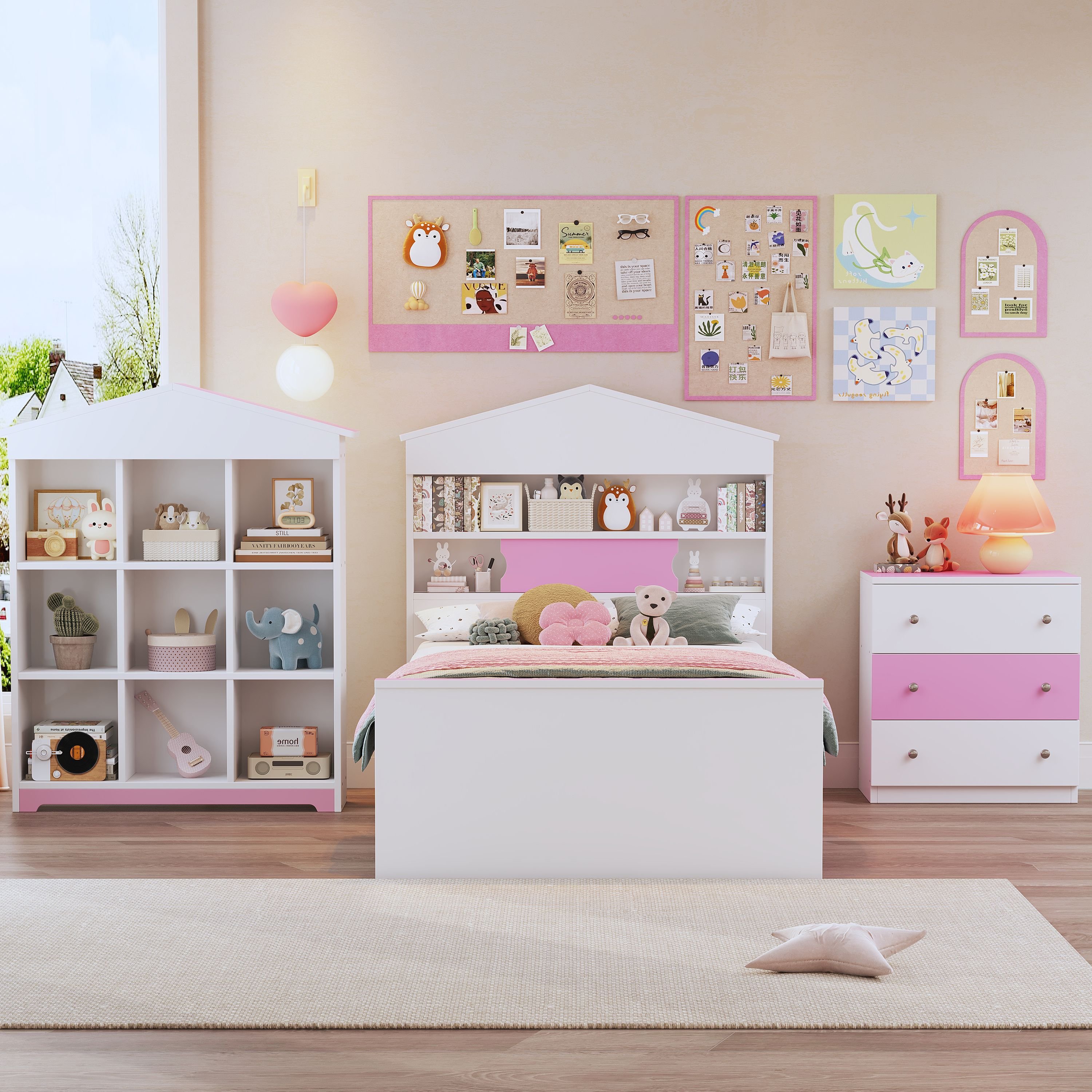 3-Pieces Bedroom Sets, Twin Size House-Shaped Wooden Bed, Nightstand and House-Shaped Stroage RackThis twin-size house-shaped wooden bed not only provides a comfortable sleeping area but also features convenient storage drawers underneath, perfect for keeping your room organized. The set includes a chic nightstand with a trendy colorblock design, adding a pop of personality to your decor. Complementing the bed and nightstand is a house-shaped storage rack, ideal for displaying books, toys, or decorative items. Crafted with quality materials, this bedroom set combines functionality with a whimsical aesthetic, making it a perfect choice for kids' rooms or playful spaces.