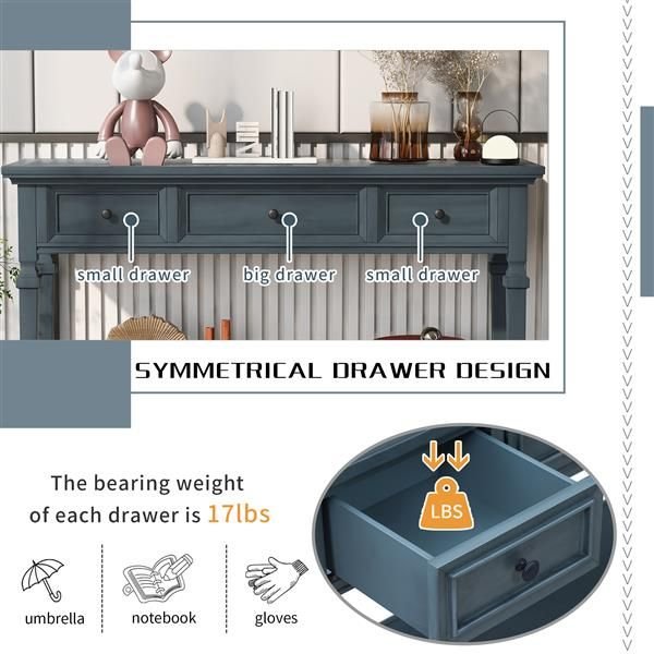 Home > Classic Retro Style Console Table with Three Top Drawers and Open Style Bottom Shelf, Easy Assembly (Navy)