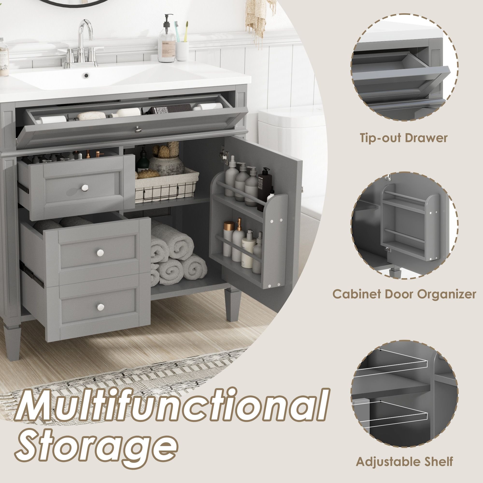 2.Amber Storage: In order to meet your storage needs for various items, this bathroom vanity is equipped with very sufficient storage space. The entire bathroom cabinet has two drawers for daily necessities, a tipout drawer for small items, and a cabinet for medium and large items with shelves that distribute space reasonably. In order to further rationalize and expand the space you can use, we also designed the cabinet door organizer on the cabinet door, so that there is a lot of usable space