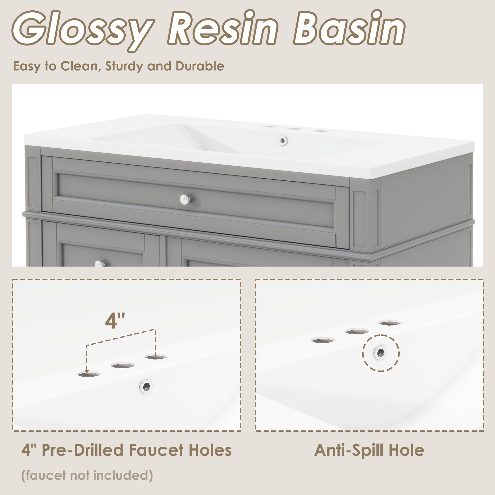 3.MultiPurpose Cabinet & Concealed Storage: Are you looking for stylish and functional storage solutions for your bathroom? Our bathroom vanity provide ample space for all your toiletries and bathroom essentials. The combination of the cabinet body and the drawer perfectly stores all kinds of bathroom products and keeps the necessities away from water stains and dust. Softclose doors and drawer fronts feature a waterresistant paint finish for durability.