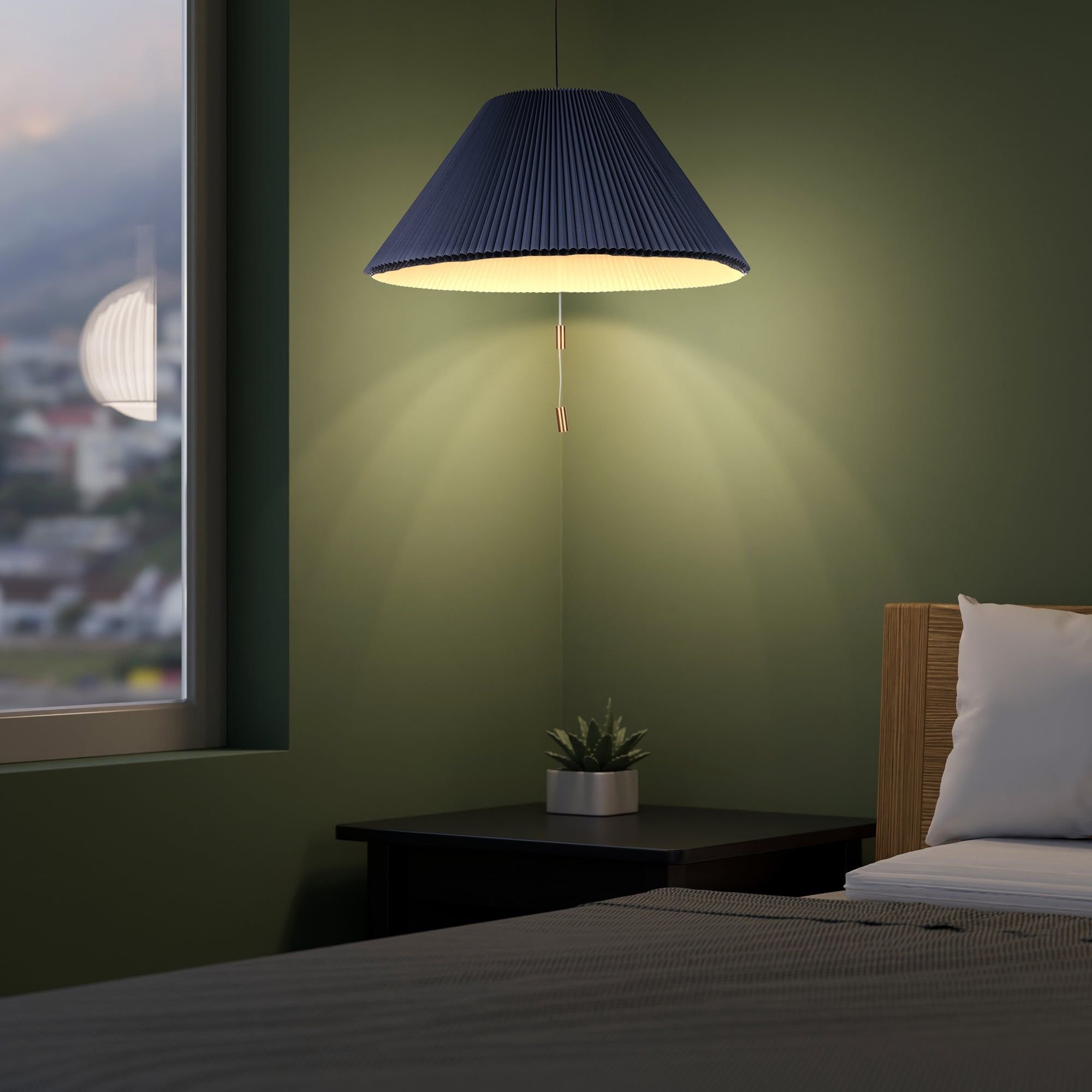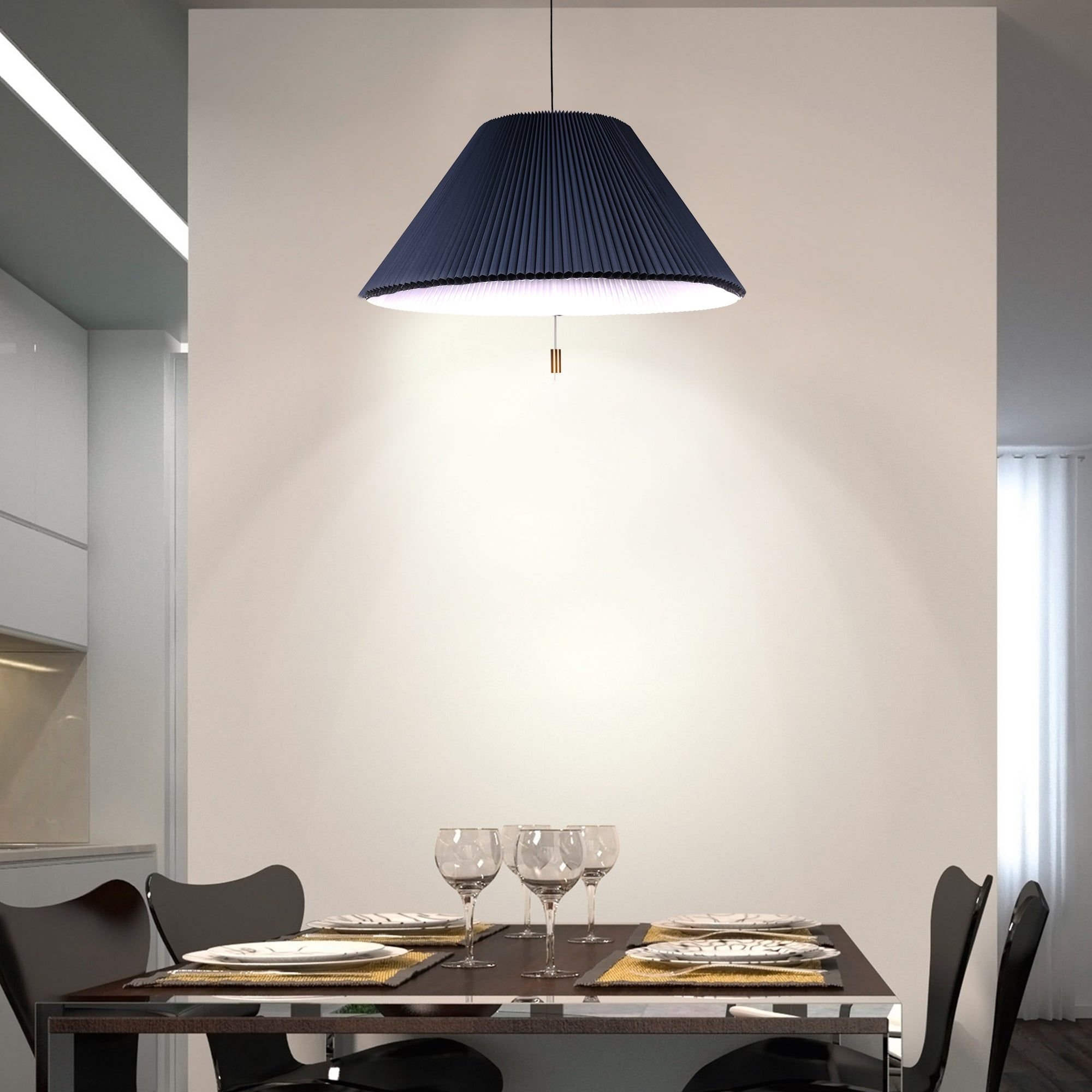 It only takes the pull of a string for your pendant light to change its shape and refresh the ambiance of the room. Inspired by the mechanism of shutters; this shape-shifting pendant lamp showcases a special shade that can be switched between circular; frustum; and cylindrical to create enticing patterns of light and shadow. The origami-style construction and a gracious shade of blue lend it an element of classic elegance that easily melds with a variety of décor styles.