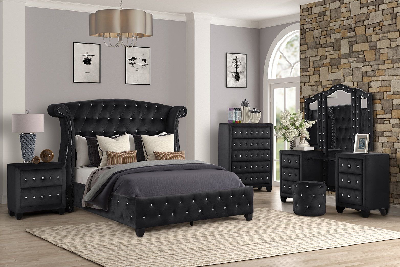 Introducing the versatile bedroom set, available in both 4PC and 5PC and 6PC options, each designed to bring modern elegance with a hint of glam to your bedroom. Crafted from wood and adorned with Crystal Tufted detailing, this collection is the epitome of sophistication. In the 4PC set, you can choose between a bed, mirror or vanity mirror, and either a dresser or a vanity, along with a nightstand. The 5PC set includes all these elements plus a spacious chest for enhanced storage. Please note that each set allows you to select either a dresser or a vanity, ensuring you have the flexibility to create your dream bedroom with the pieces that suit your style and needs. The 6PC set includes all these elements plus a extra Nightstand for enhanced storage