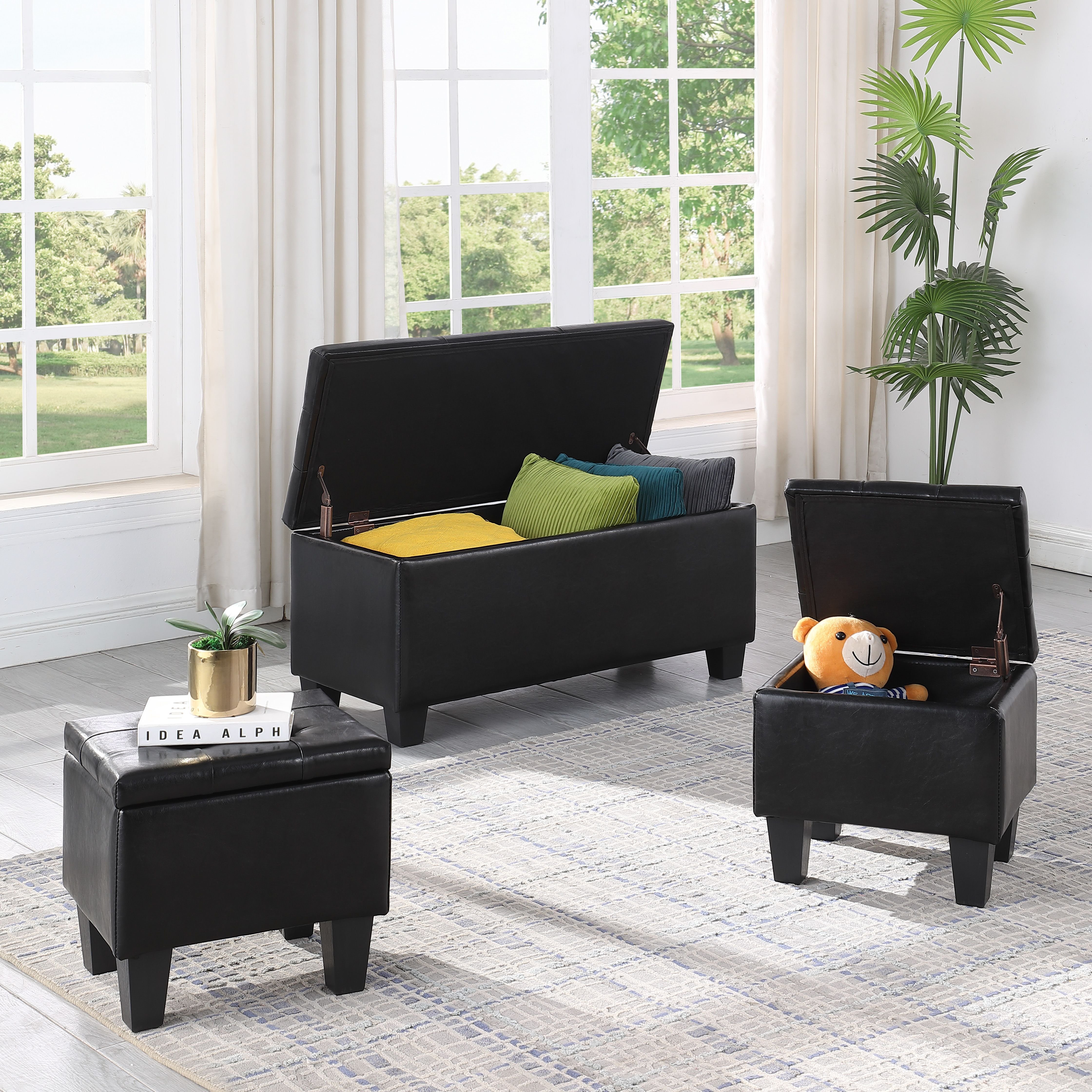 Large Storage Ottoman Bench Set, 3 in 1 Combination OttomanWhat You Get, Including one Storage Bench and two Small Storage Ottomans, In one package. Ottoman bench holds up to 250lbs, easily seats you and your family.All three of our ottoman have a storage function. can meet different kinds of storage needs, such as storing toys, books, magazines, shoes, seasonal gear and more. A silent storage assistant make your life in order.The classic American Tufted design is a perfect fit for either the bedroom or the living room, and is equally suitable for the foyer, entrance or in front of the sofa.Covered with linen upholstery with tufted detailing at the top for an upscale look. Safety hinges ensure the lid remains open until you put away all items, preventing slamming.Our products only require mounting feet, no complicated installation process is required.The storage bench can be installed within 5 minutes.